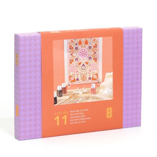 Djeco har produceret en serie der hedder Atelier Grands Augustins - unge og voksne der ønsker et kreativtprojekt i lækre materialer.Dette ATELIER 10 er med silkemaling i mørkeblå og brun – er en elegant og kreativ kunstart, som næsten alle kan deltage i. Med Atelier 10 får du en nem og inspirerende introduktion til teknikken, hvor flydende silkemaling males direkte på silke.